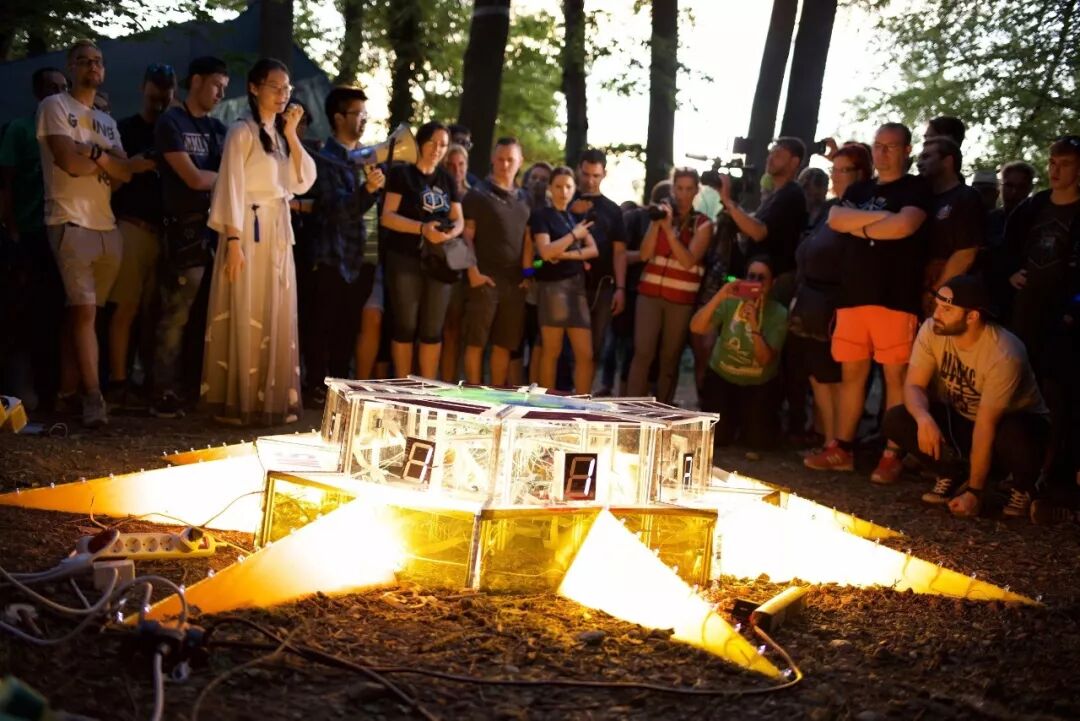 夜幕降临,实体 Portal「Afflatus Octet」就快竣工。可参观拍摄的大部队来得更快,几个男生一会抬头看看摄像机到哪了,一会低头调试怎么也弄不亮的灯具。