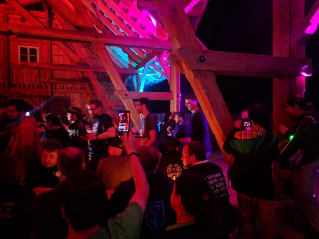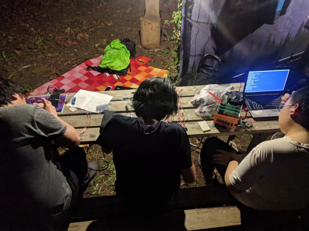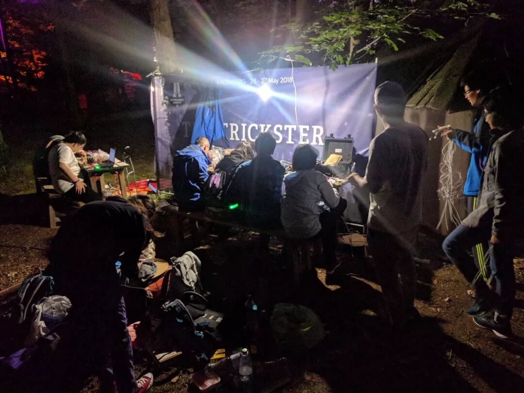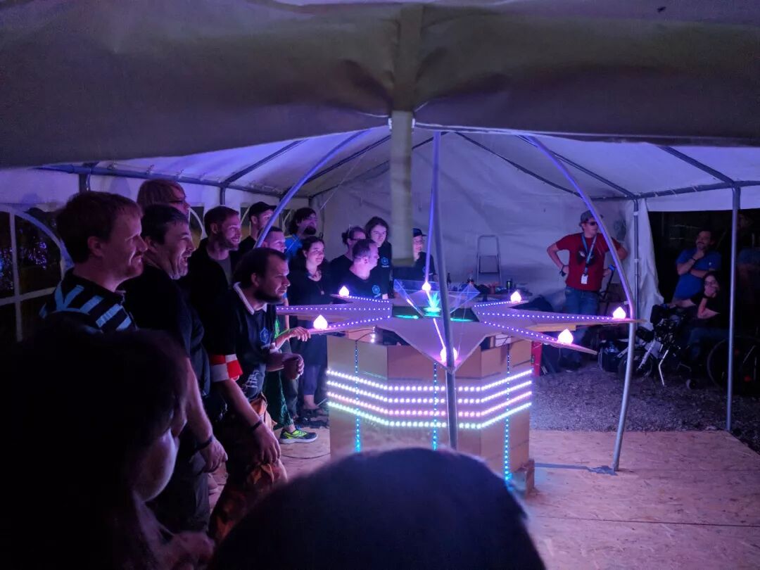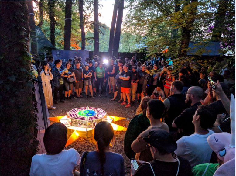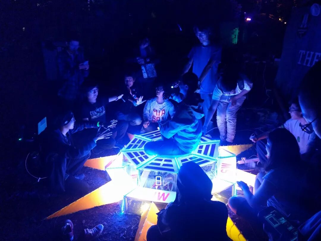 我们对面的一支队伍看我们着急,决定替我们挡一刀,给我们争取时间。此时,队伍已经在参观他们的跳舞机。我们这边@鸮已经紧张的神情发呆,而我看着po想着先不管里面,把盖子盖起来先应付过去。此刻,@AV139的理线工作有了进展,总工程师@neo的电路也可以摇摇晃晃工作起来,大家赶忙把盖子盖起来。趁着最后一个缝隙,一把手电被丢进内部发光。@AV139这时喊着插线板插线板,@neo喊着接电接电,两人现场几乎吵了起来。“你tm要电死我???!!!”。 @AV139手拿照明电线的裸线,摁进插线板的插孔,拿插头压着狠狠插了进去,灯光亮起,照亮即将转身的人群,一阵欢呼响起。在摄像机面前,身着汉服的@鸮,演讲几乎是一个词一个词的在讲,@DavideZhu在旁边不时帮着补充。我在人群后方静静站着,注视着,直到人群散去。@鸮和@海王在面前抱在了一起,@AV139则是一把掀开了盖子,继续debug。
