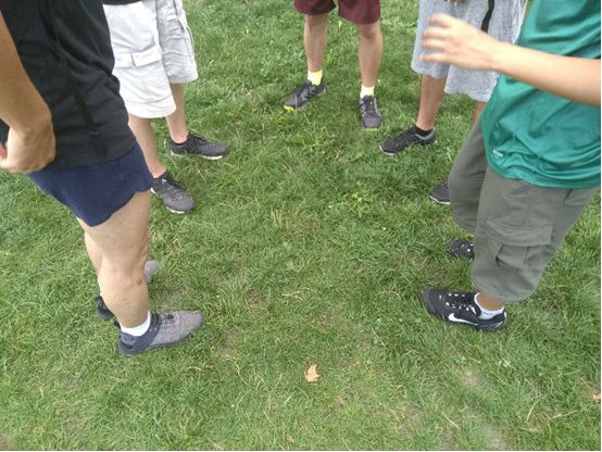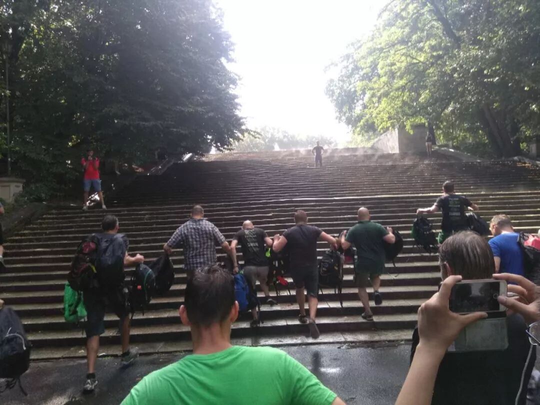 正在修整时,那边说要比赛。每个队伍出两个人,要负重爬楼梯。其中一个人要先负重(队伍里四个人的背包)爬楼梯,之后再背着另一个爬。我们的队长果然是身经百战,见的多了(他昨天可是参加了 GoRuck),果断担起了爬楼的任务。之后我们选了队伍里最轻的人和最轻的四个包作为负重。
