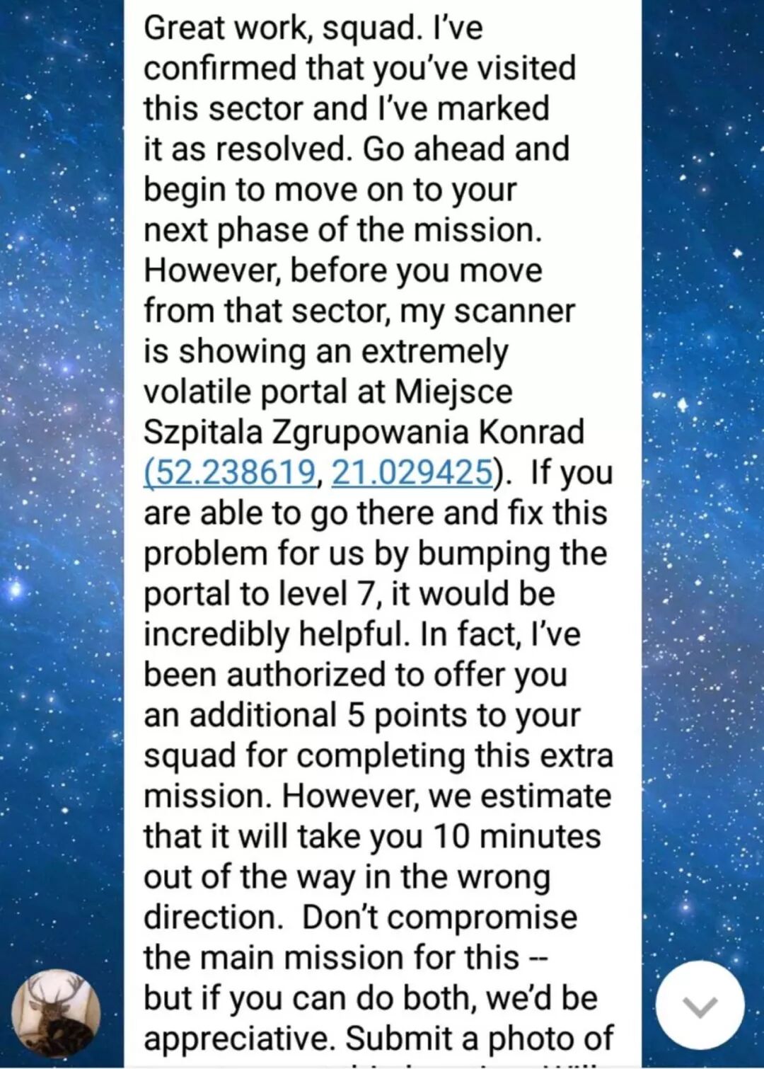 我们到达任务地点以后,被要求合照。但是那个队友可能没看到消息。径直前往了第 7 个 po.