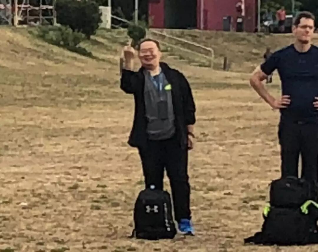 当然不是简单的接力啦。Jeff 指着 50 米外的垃圾桶:我会站在那个桶旁边的水里。跑过去之后,在我面前扑进水,要完全进去,头也不能露出来。之后跑回来,就下一个!