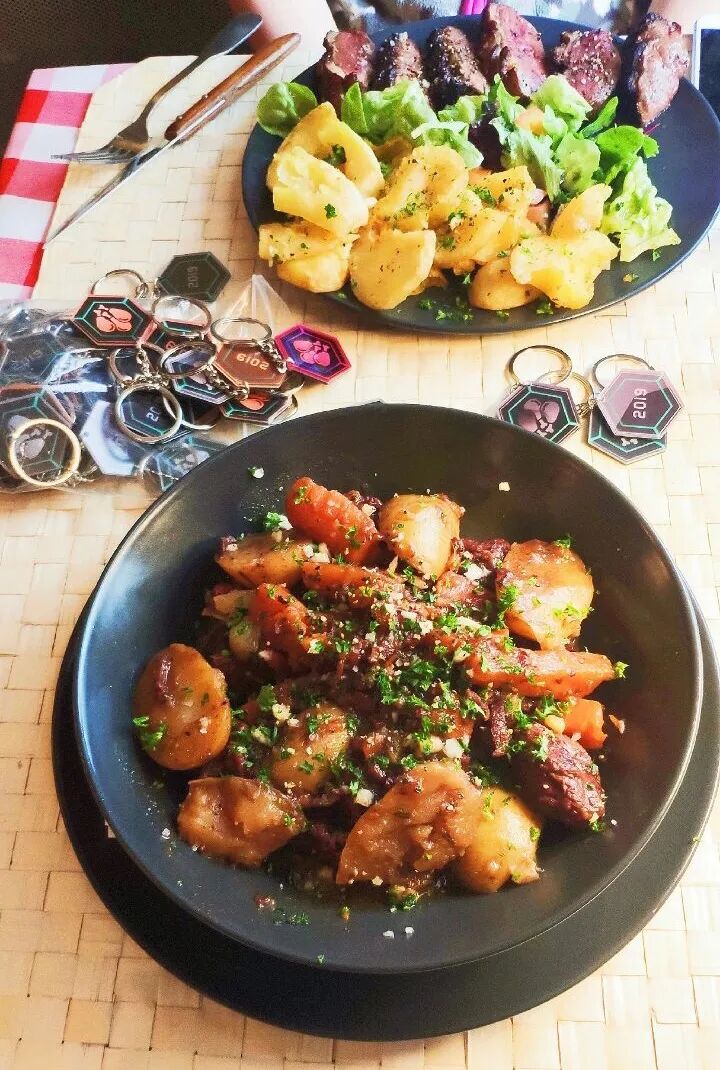 我想念来到里尔的第一顿饭,是我在火车站和鸮会合之后去吃的法餐。饭桌上我们分了菜格瑞斯专属的约饭牌。这种东西当然是要倒出来好好炫耀一下嘛。前菜是奶油流心蛋,主菜是土豆炖牛肉,这家店估计是打死卖盐的了,对面的鸮吃了鸭腿说「好咸好咸好咸」之后狂喝水。来法国必点巧克力慕斯,我也不知道我是什么毛病,大概是平时吃得太清淡,终于出门了,可以放纵一下了吧。下午……下午睡觉了。一早赶路,两人都挺困的,晚上八点左右才出门觅食。在住处附近找了家中餐馆,打包了一份饭和一份菜回酒店吃。老板娘听说我们只是来这里玩一个周末,说了一句:「那我们是擦肩而过啊。」