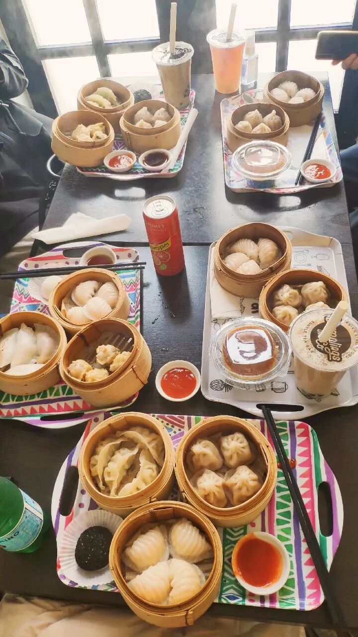 精彩的活动当然是在第二天的。早上闪闪驾到,带来了摩洛哥的草莓和自己亲手做的蛋糕,被我们三个姑娘毁尸灭迹,甚至后来的两位都不知道有蛋糕这么一样东西。是的,我现在告诉你们,我们吃包子前还吃了蛋糕,还吃了草莓。哈哈哈,哈哈哈。中午在市中心找到了一家吃包子的地方。疫情下的聚餐,有着特殊的餐前礼仪。「大家停一停,手伸一下。」五双手齐刷刷围成一圈,每人一滴消毒液。然后是互报 14 天内的行程。某人诚实地说:「先在柏林看了五场电影,然后坐飞机去了布鲁塞尔,然后坐大巴来里尔」。看,我们中出了一个危险分子,可是那又怎么办,「来都来了」,自然还是坐在一起吃吃喝喝。