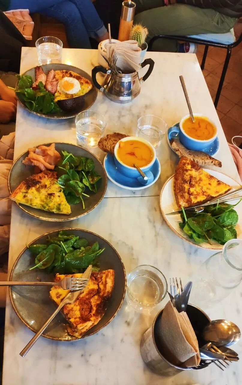 里尔的第三天,天终于放晴了。中午我们跟着 MD,一路走到了一家吃 brunch 的店。一人一块 quiche(法式咸派)加一点配菜,以及南瓜红花汤店里有多种口味的蛋糕:巧克力、胡萝卜、柠檬(吃群主了)等等早上我没有去 MD 合照,任务是自己一个人做的,午饭也没什么心情吃,因为我摊上了一件破事。因为去了确诊快 100 的法国,我被荷兰的华裔舍友歧视了。这让我很头大,她甚至要求我单独去找一个地方住。我在荷兰几乎算是无亲无故,临时找地方麻烦谁我都不愿意,况且我是交了房租的。饭桌上,几个人围着我一边安慰一边声讨,而我几乎是低声下气地跟房东求情:我全程戴口罩,回家不进厨房,摸过的地方都会消毒等等,这才终于获准进入我自己的家门。